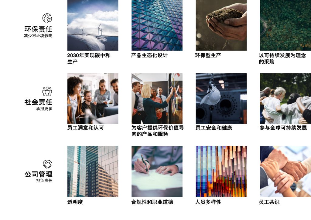 不过,ESG中与影响气候变化相关度最高的课题都属于环境保护板块,它们包括了我们要为在2030年之前实现全球碳中和而努力的承诺、进行资源友好型生产、以可持续发展为指导理念的采购活动以及产品生态化设计