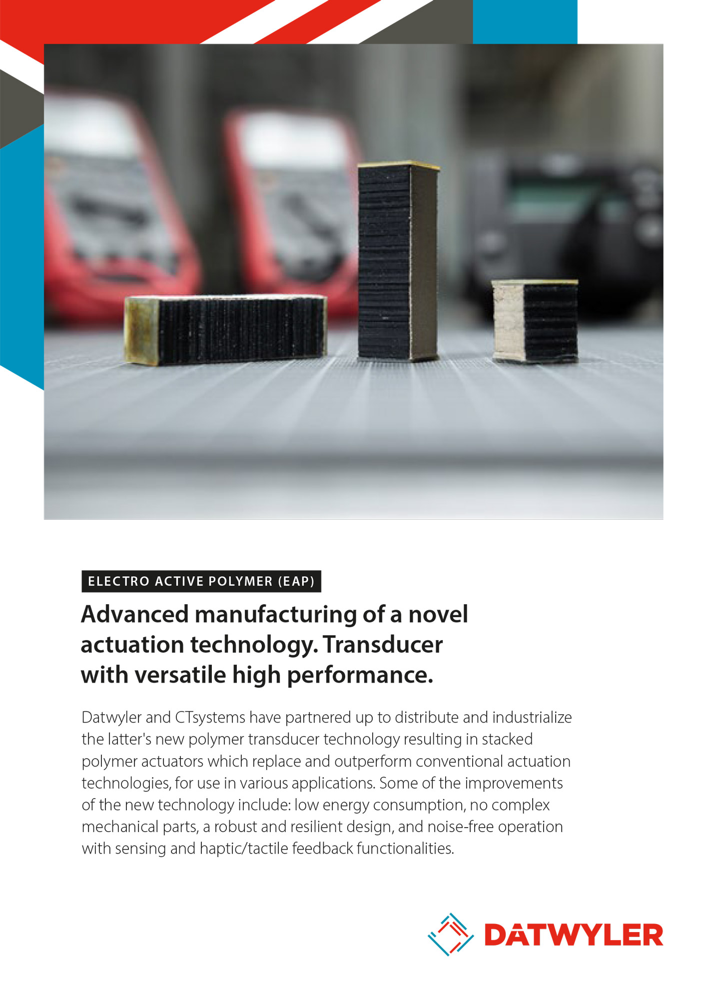 Datwyler is on the path to industrialize a new polymer transducer technology (“Electroactive Polymers” or EAPs) based on stacked polymer actuators, which was originally developed by CTsystems, a spin-off from EMPA, Switzerland. EAPs can replace and outperform conventional actuator technologies and can be used in various applications. Advantages of EAPs include low energy consumption, no additional complex mechanical parts, a robust and resilient design, noise-free operation with the possibility for energy harvesting, sensing, and haptic/tactile feedback functionalities.