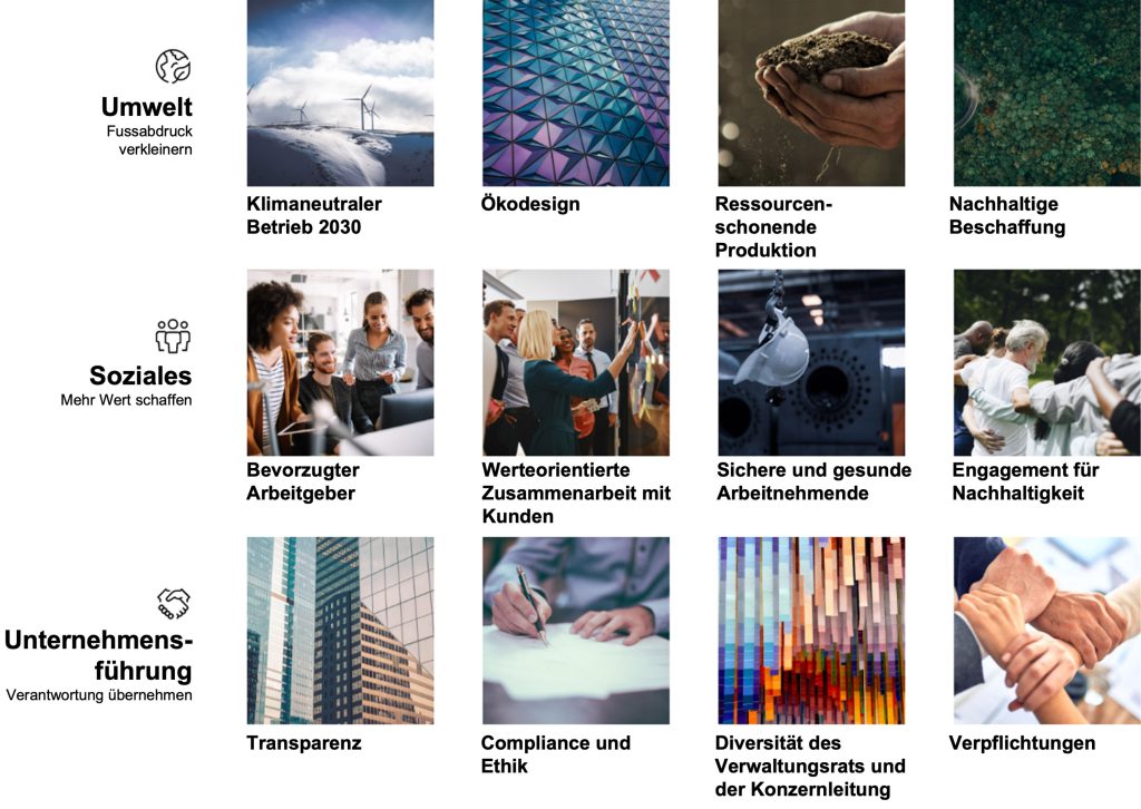 Den grössten Einfluss auf den Klimawandel übt der Bereich Umwelt aus – mit Themen wie unserer Selbstverpflichtung zu Klimaneutralität bis zum Jahr 2030, ressourcenschonender Produktion, nachhaltiger Beschaffung und Ökodesign.