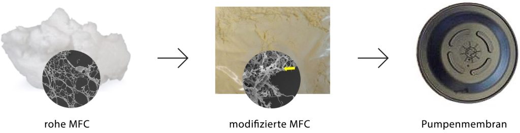 Erste Versuche sahen den Ersatz von petrochemischen Aramidfasern durch modifizierte MFC vor. Die Ergebnisse zeigen eine gute Kompatibilität zwischen dem MFC-Füllstoff und der Elastomermatrix mit starker Verstärkungswirkung, die sogar besser ist als jene, die mit herkömmlichen erdölbasierten Aramidfasern erreicht wird. Basierend auf diesen vielversprechenden Forschungsresultaten hat Dätwyler das Verfahren patentiert und wird in einer nächsten Phase an der Umsetzung für die industrielle Massenproduktion arbeiten. Die Entwicklung dieser neuartigen Füllstoffe auf Cellulose-Basis wird ein wichtiger Schritt zur Steigerung der Nachhaltigkeit von Elastomerprodukten wie zum Beispiel Pumpenmembranen sein.