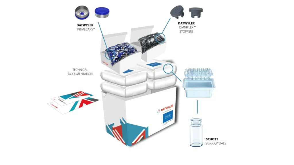 The Datwyler StarterPack™ includes OmniFlex® Stoppers, PrimeCap™, and SCHOTT adaptiQ® vials. All products provided are ready-to-use (RTU) and have been sterilized in accordance with pharmaceutical and regulatory guidelines.