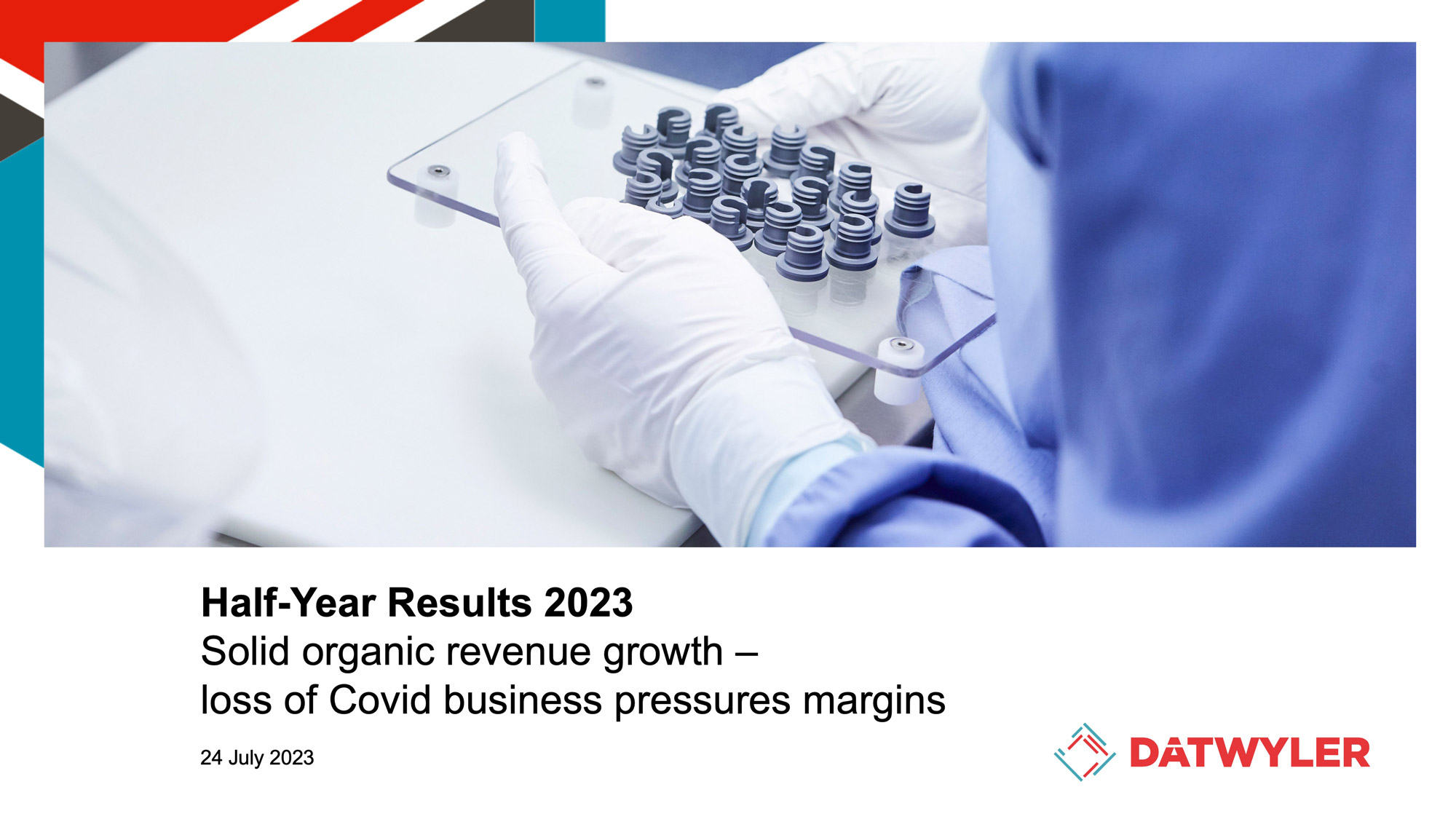 In the first half of 2023, Datwyler increased revenue to CHF 602.7 million in a challenging environment. Adjusted for currency and acquisition effects, this equates to solid organic growth of 5.6%. The almost complete loss of the high-margin Covid business and destocking by customers led to underutilization at the recently expanded plants. EBIT and the EBIT margin declined to CHF 60.5 million and 10.0%, respectively. However, the growth trends in the markets are intact, as is shown by the large number of promising new projects with existing and new customers in all the markets served.